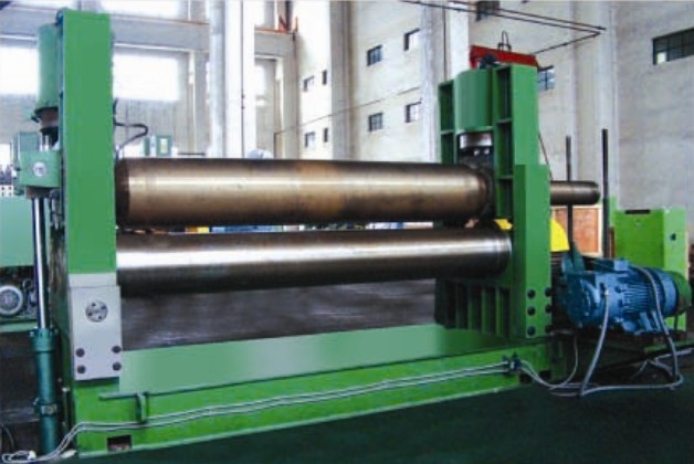 本機(jī)機(jī)構(gòu)形式為三輥對稱式,上輥在兩下輥中央對稱位置坐垂直升降運(yùn)動,通過液壓缸內(nèi)的液壓油作用于活塞而獲得,為液壓傳動,兩下輥?zhàn)餍D(zhuǎn)運(yùn)動,通過減速機(jī)的輸出齒輪與下輥齒嚙合,為卷制板材提供扭矩。本機(jī)結(jié)構(gòu)緊湊,操作維修方便。